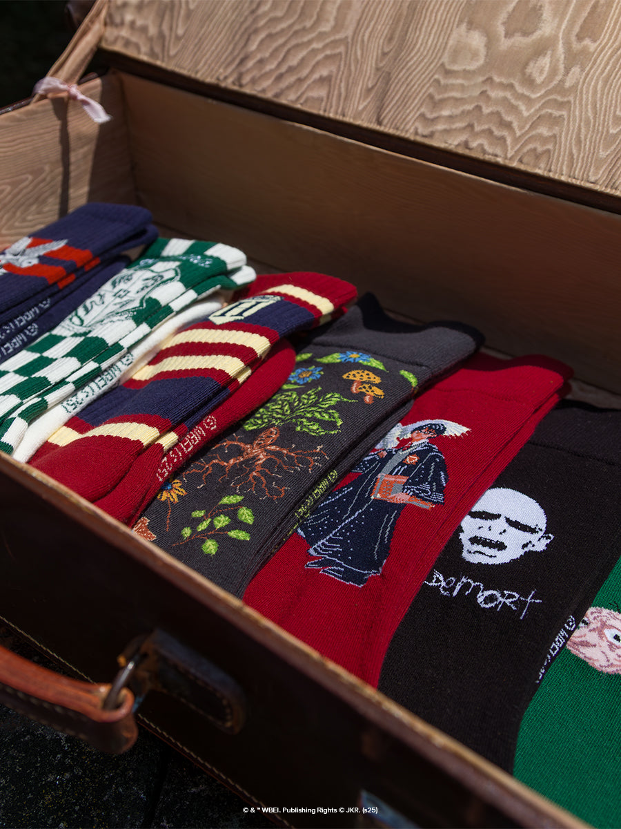 The collection goes beyond socks with three 100% organic cotton T-shirts that reimagine timeless wardrobe staples through the lens of the wizarding world.